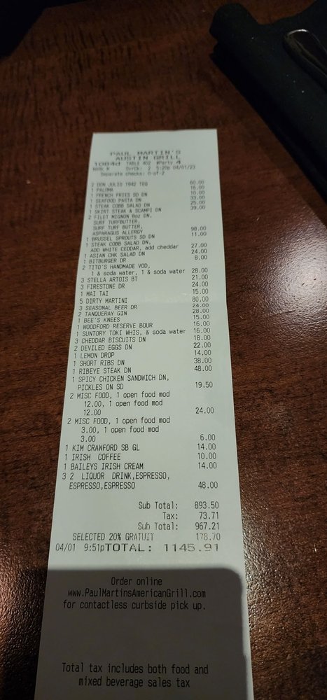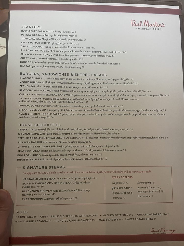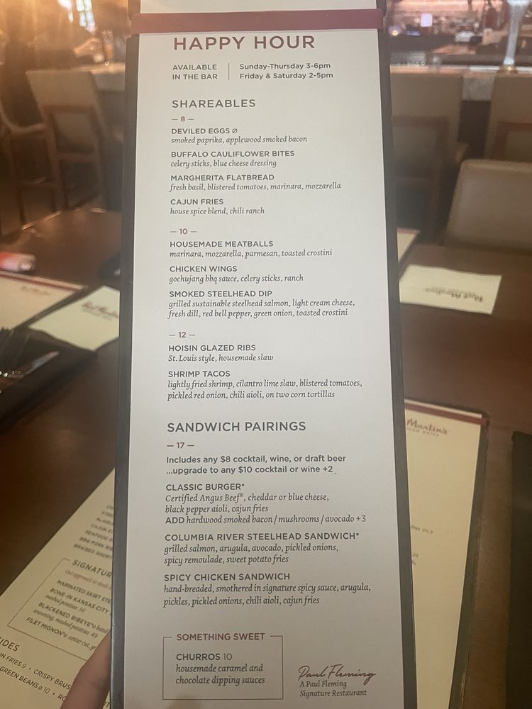 Introducing the menu at Paul Martin's American Grill, a renowned New American restaurant in Austin, TX, offering a mix of steakhouse and seafood dishes. This elegant establishment provides a range of amenities including outdoor seating, full bar, and wheelchair accessibility. Customers praise the attentive service and upscale atmosphere, making it ideal for team dinners, dates, and special occasions. The diverse wine selection and signature cocktails pair well with dishes like calamari, short rib, seafood pasta, and chicken parmesan. While some reviews mention room for improvement in certain areas, overall, Paul Martin's American Grill is a top choice for a classy dining experience with a focus on quality food and drinks. [END]